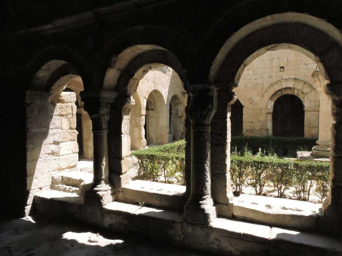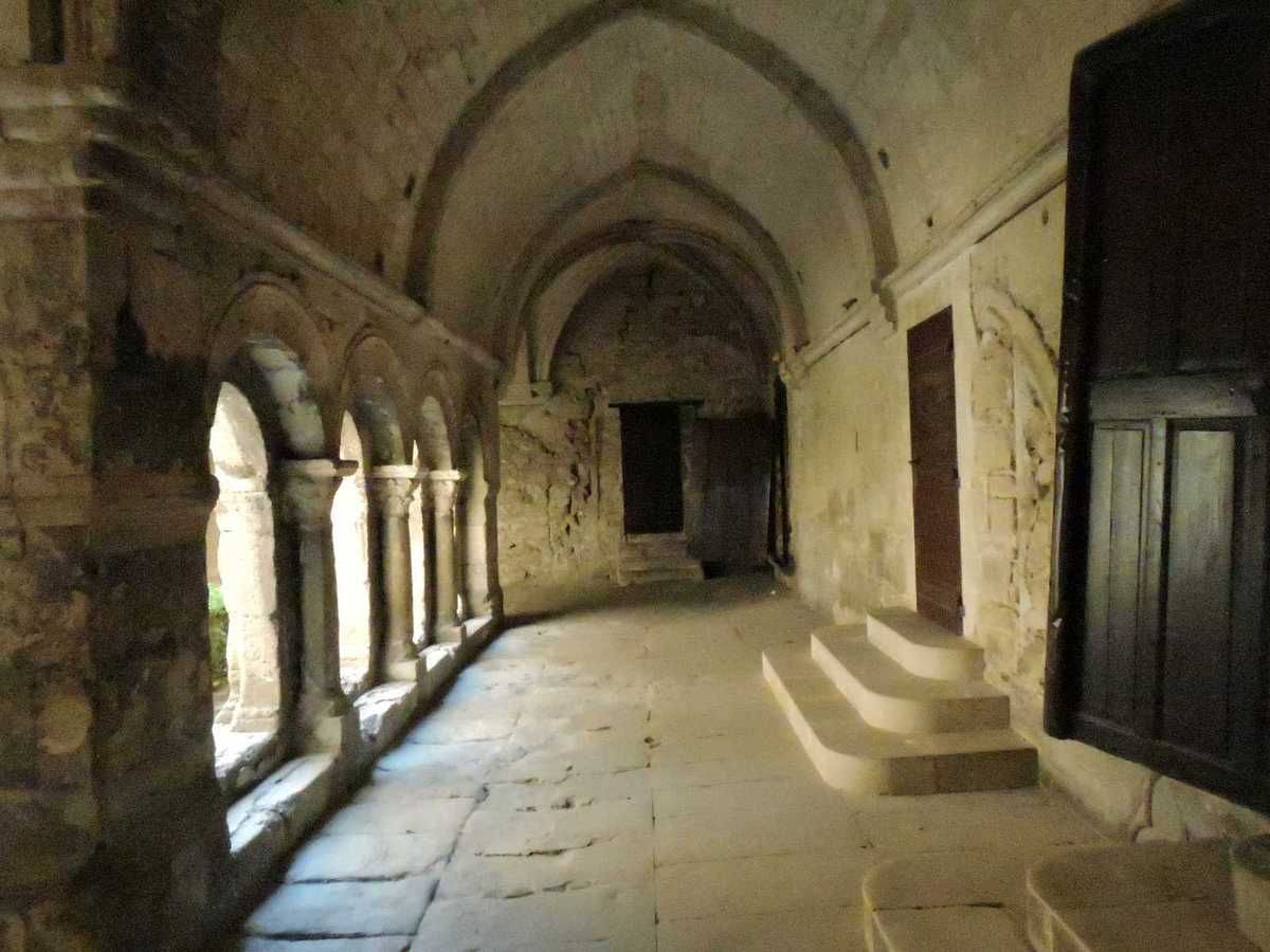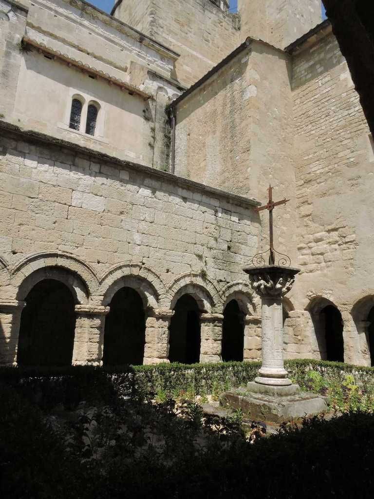 La cathédrale est jointe à son cloître du 13ème aussi. Galeries ajourées d'arcatures en plein cintre. Pas de visite de la salle capitulaire. Le cloître était bordé par l'église St Pierre dont il reste trois arcades en plein cintre que l'on peut voir sur les photos de l'extérieur dans la cour de l'école.