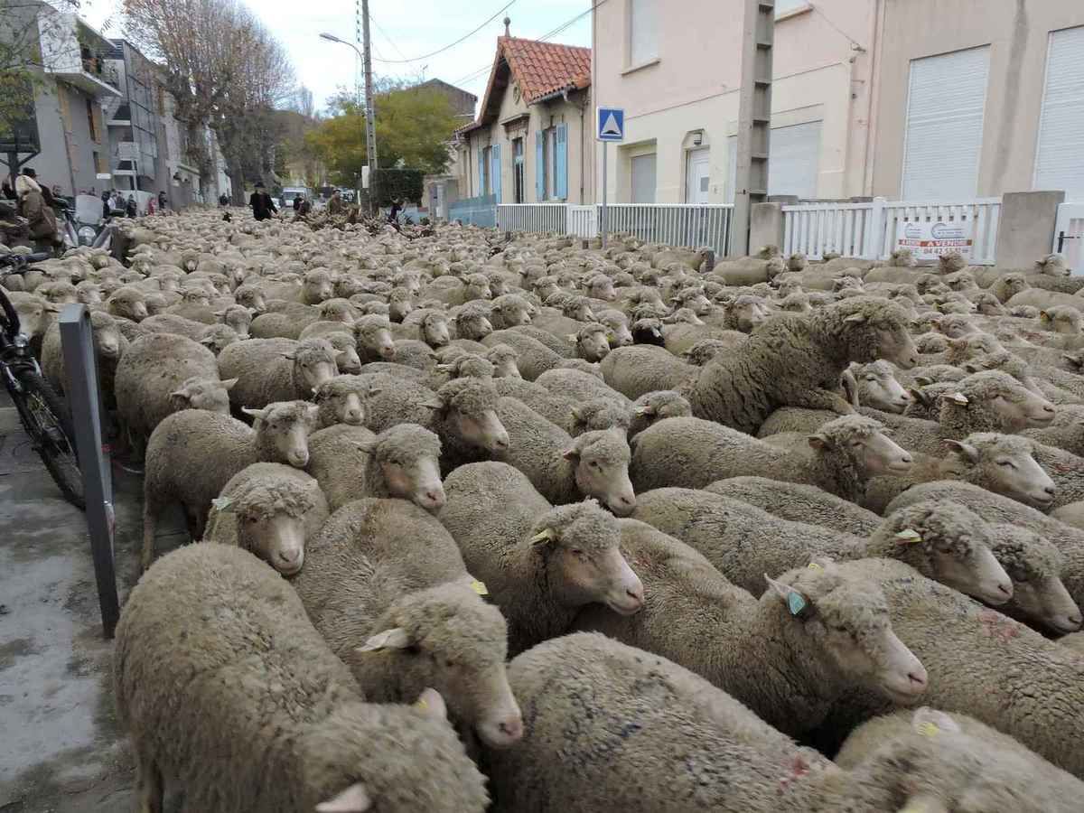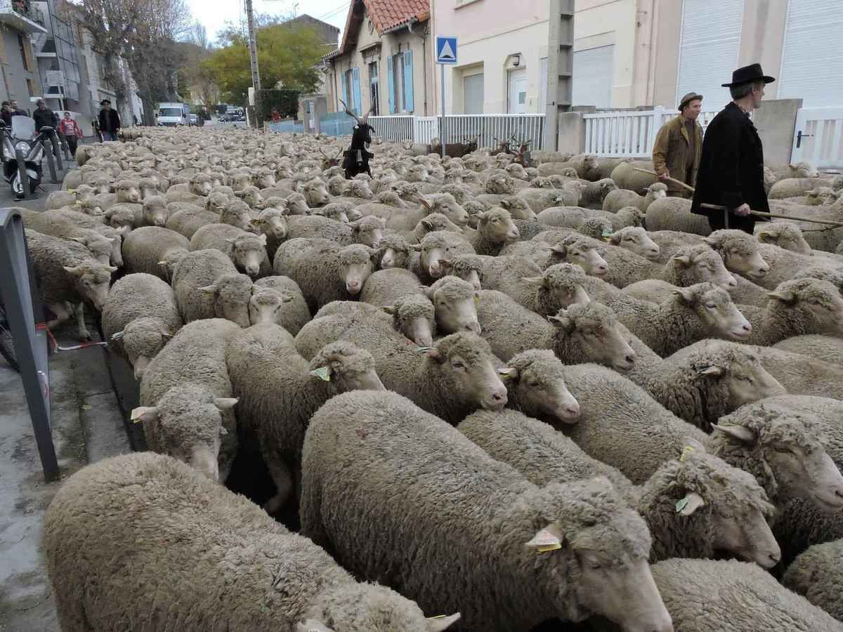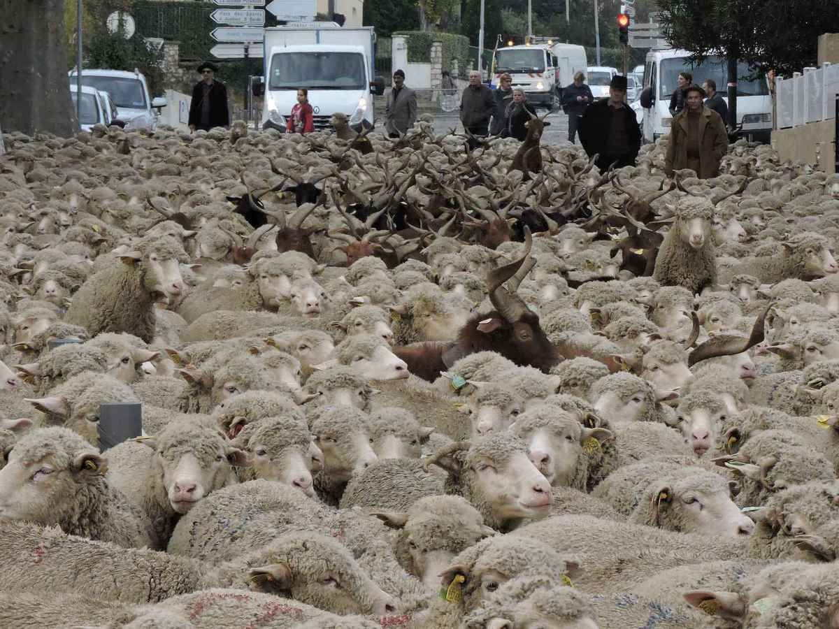 Des moutons occupent les rues, couverts de leur laine, des bergers les encadrent et tout ce troupeau suit le berger aux moutons qui précède cette transhumance suivi du flouca, cette brebis décorée qui permet de repérer l'avancée du troupeau.
