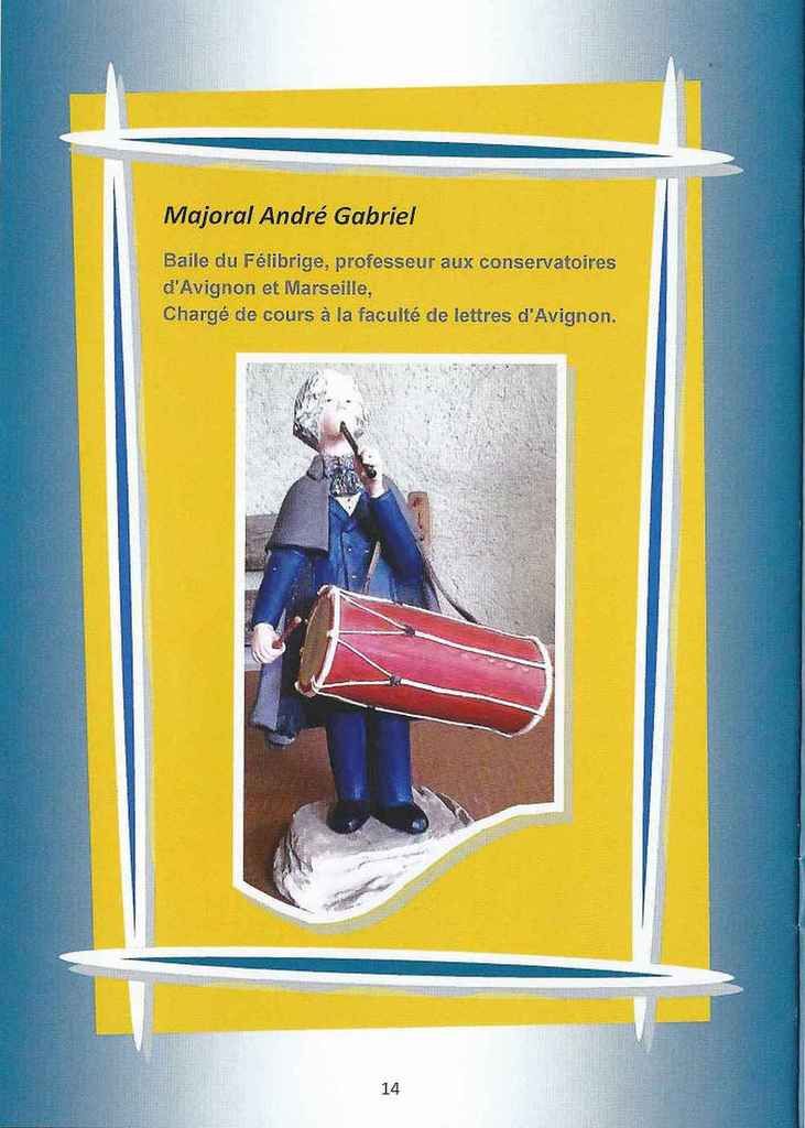 André Gabriel est un Félibre, Professeur de Galoubet Tambourin au Conservatoire National de Marseille, ainsi qu'à l'Ecole Nationale de Musique d'Avignon.