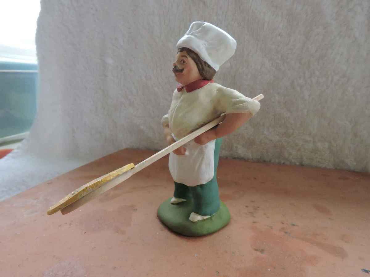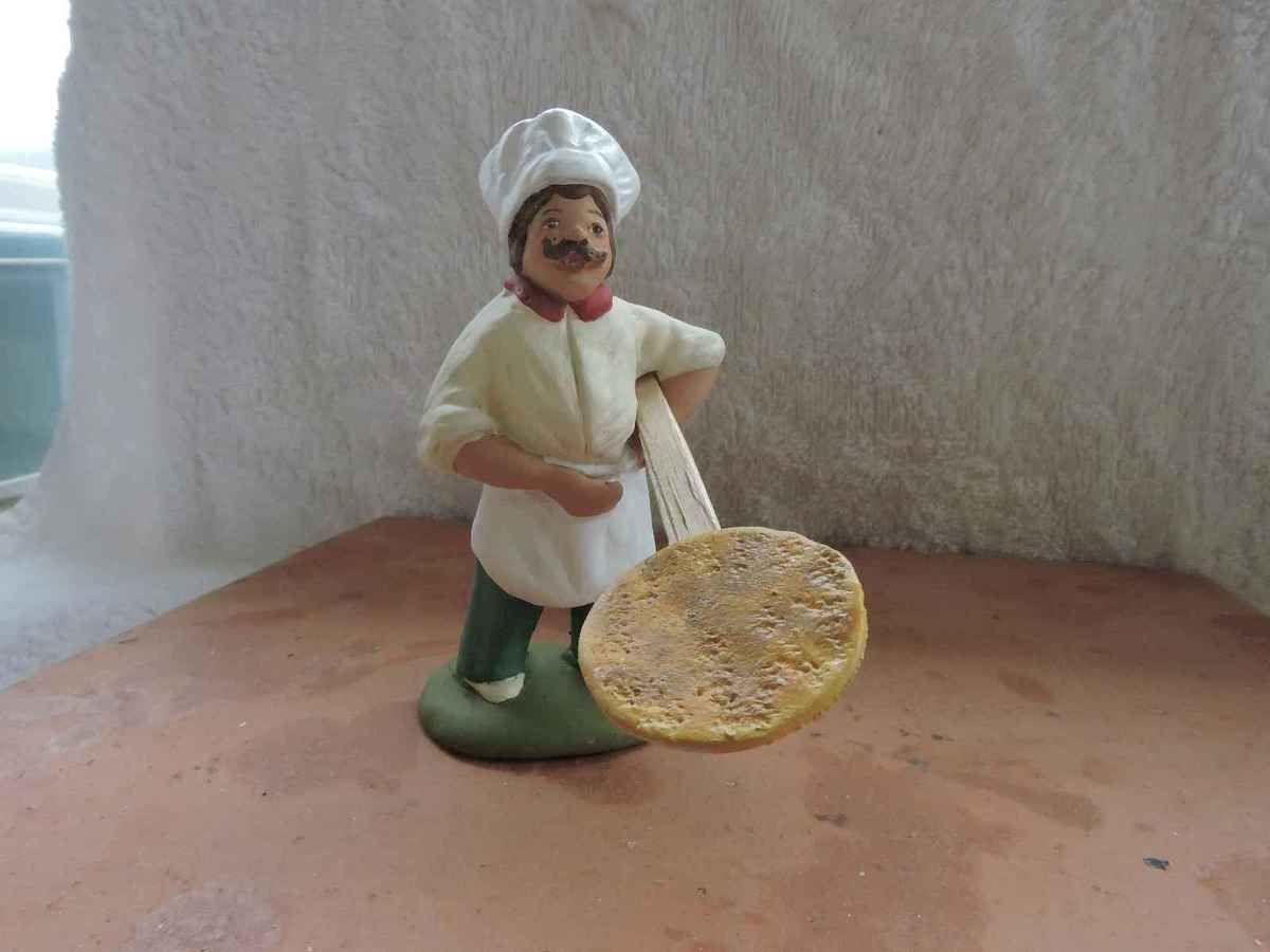 Impossible pour moi de visiter un ou une santonnière, fusse-t-elle amie, sans céder à un coup de cœur. Ce soir là, c'est mon couple vache et veau et puis le pizzaïolo qui a surtout la gentillesse d'avoir été préparé aussi pour les connaisseurs de la Provence en fabricant de Socca. Je raconterais l'histoire de la Socca et de la Cade sur un autre sujet mais c'est aussi, là, une particularité culinaire de la Provence qui mérite d'être connue car très ancienne, et très bonne en plus…