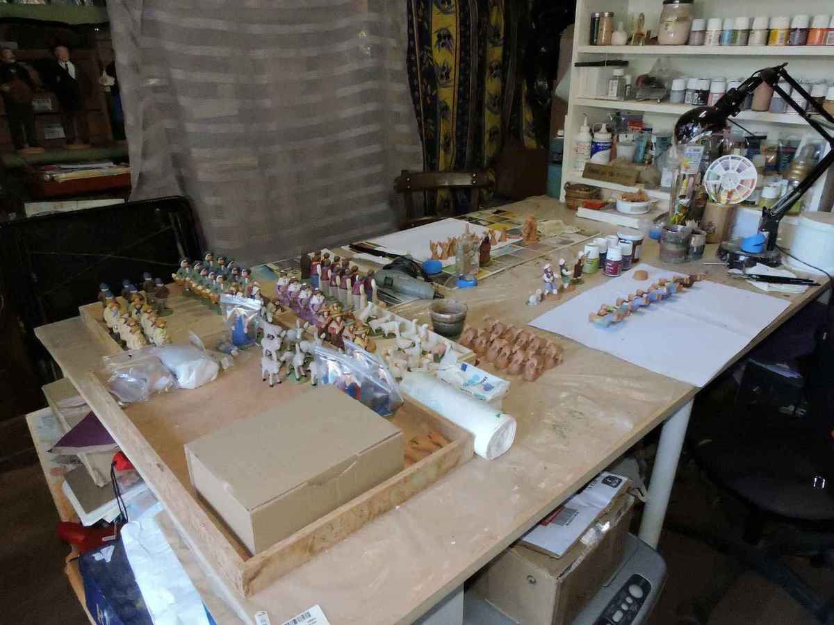 Son atelier est comme celui de nombreux artistes santonniers, un peu brouillon mais tout est finalement rangé, le four est nickel propre, les moules sont classés, les peintures sont alignées, et les santons fraîchement sortis des moules sont en train de sécher et à la quantité, on s'aperçoit vite qu'on est loin des productions "gigantesques" de quelques maisons Marseillaises essentiellement …