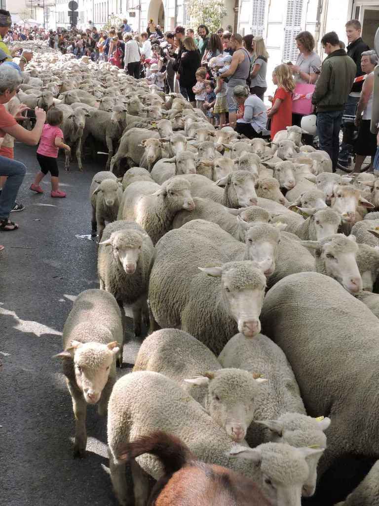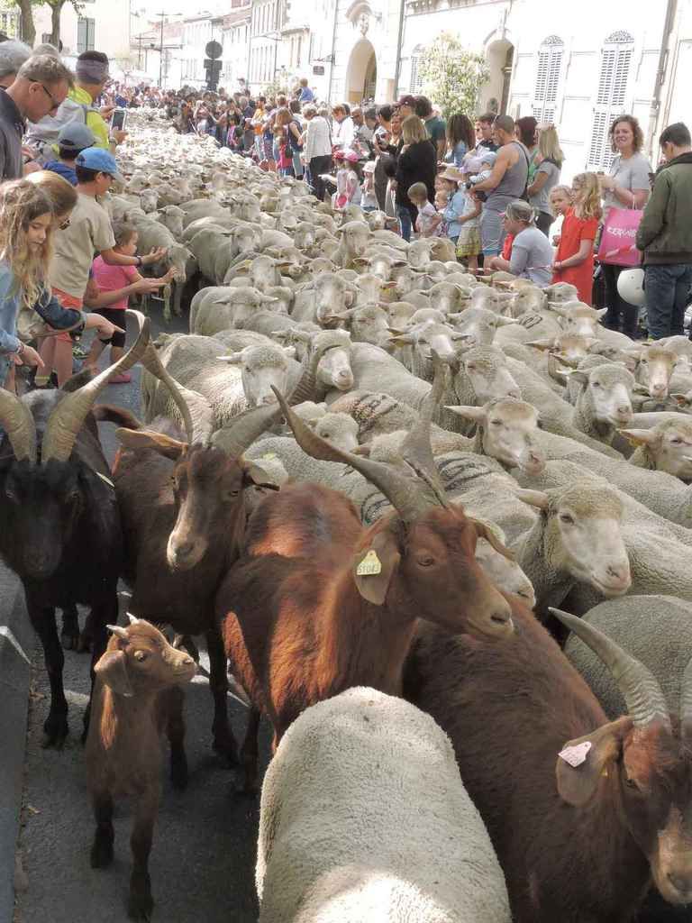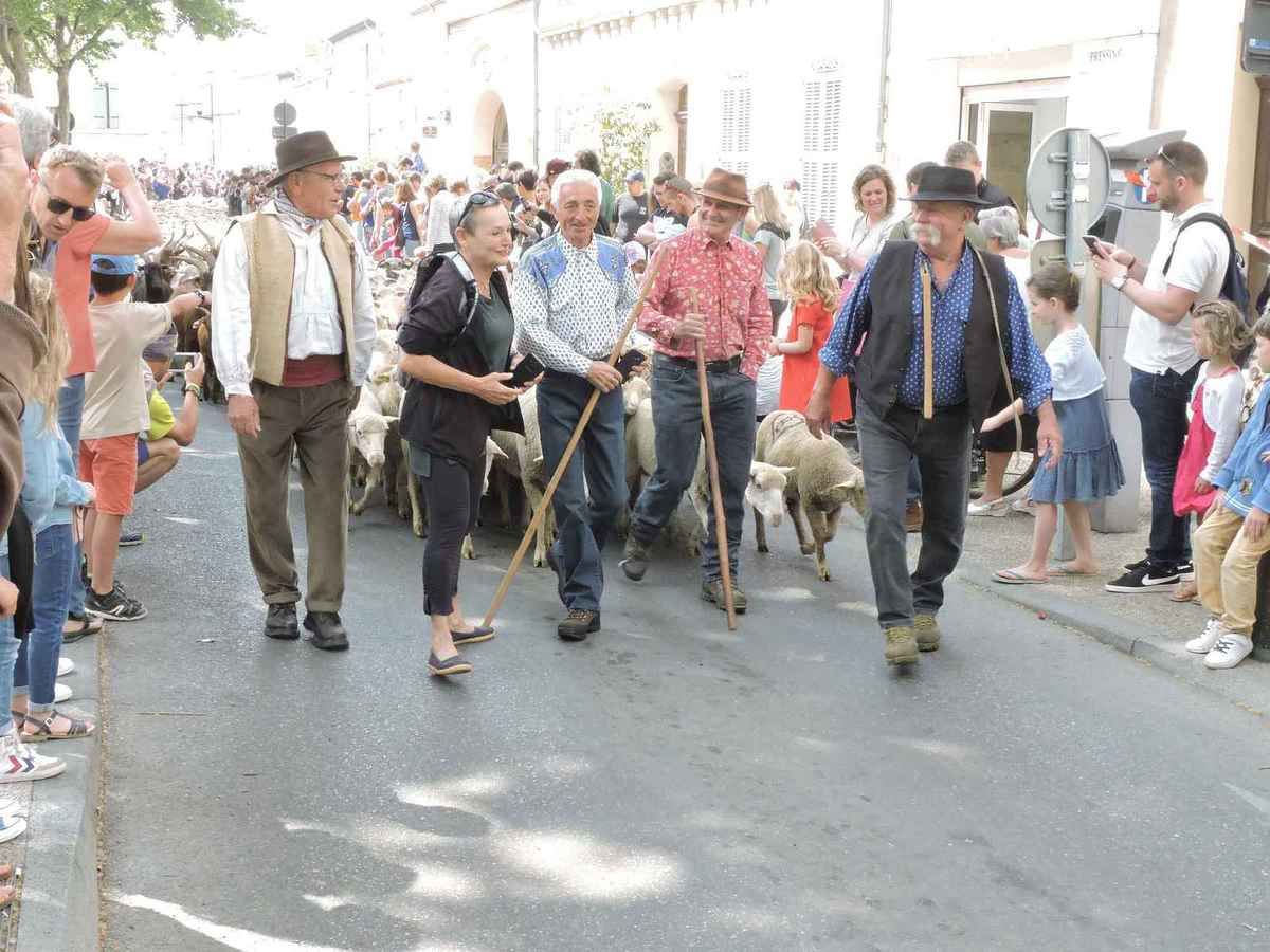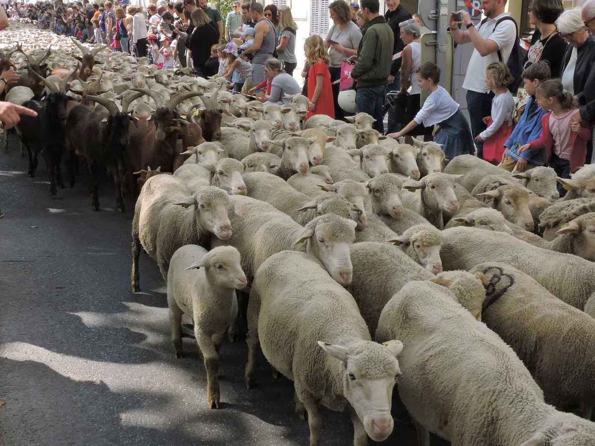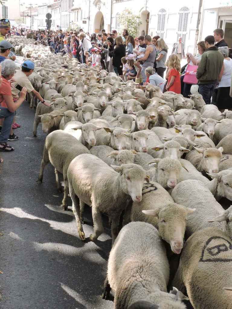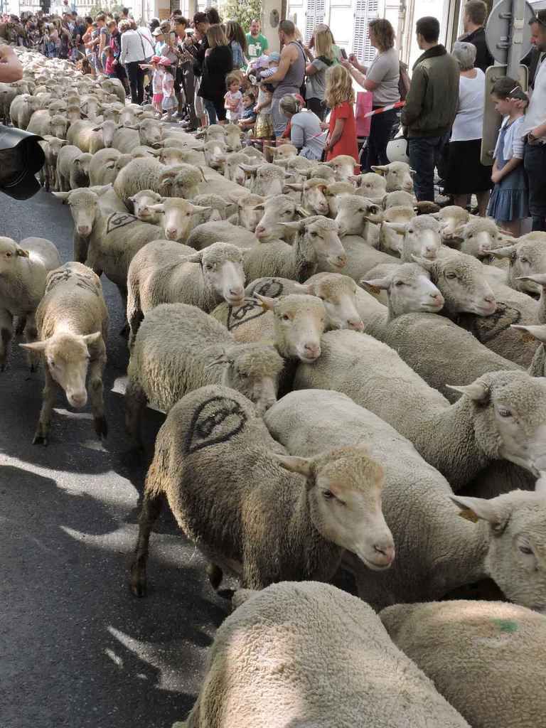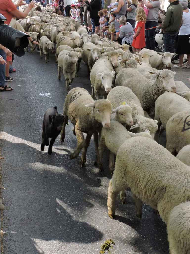 Et c'est enfin la transhumance de 1500 moutons venus de St Martin de Crau, appartenant à deux éleveurs, moutons et chèvres encadrées par les bergers qui vont partir en montagne.