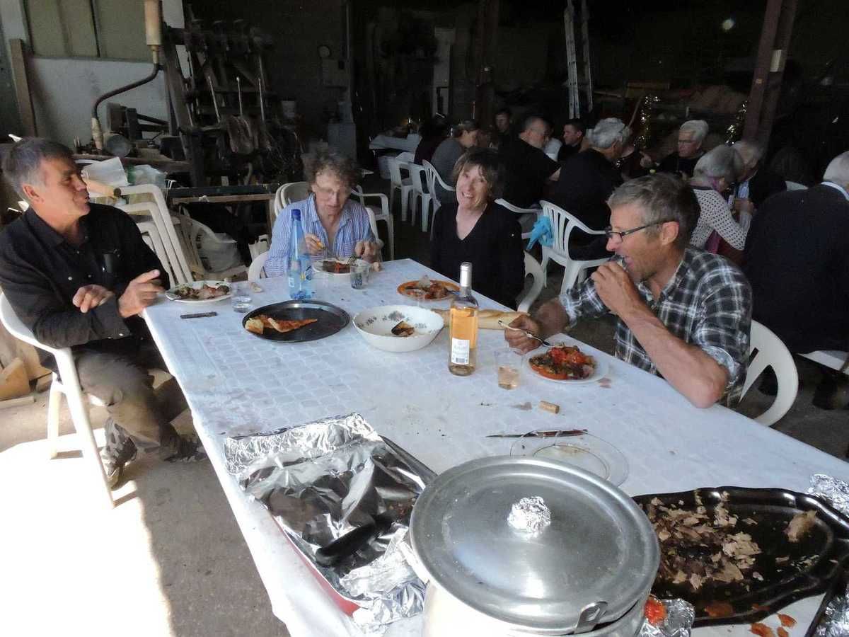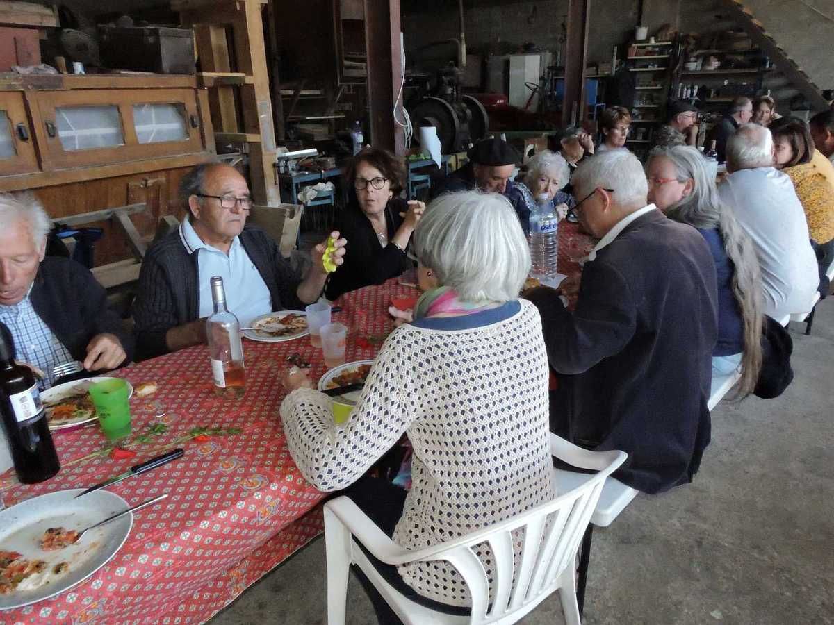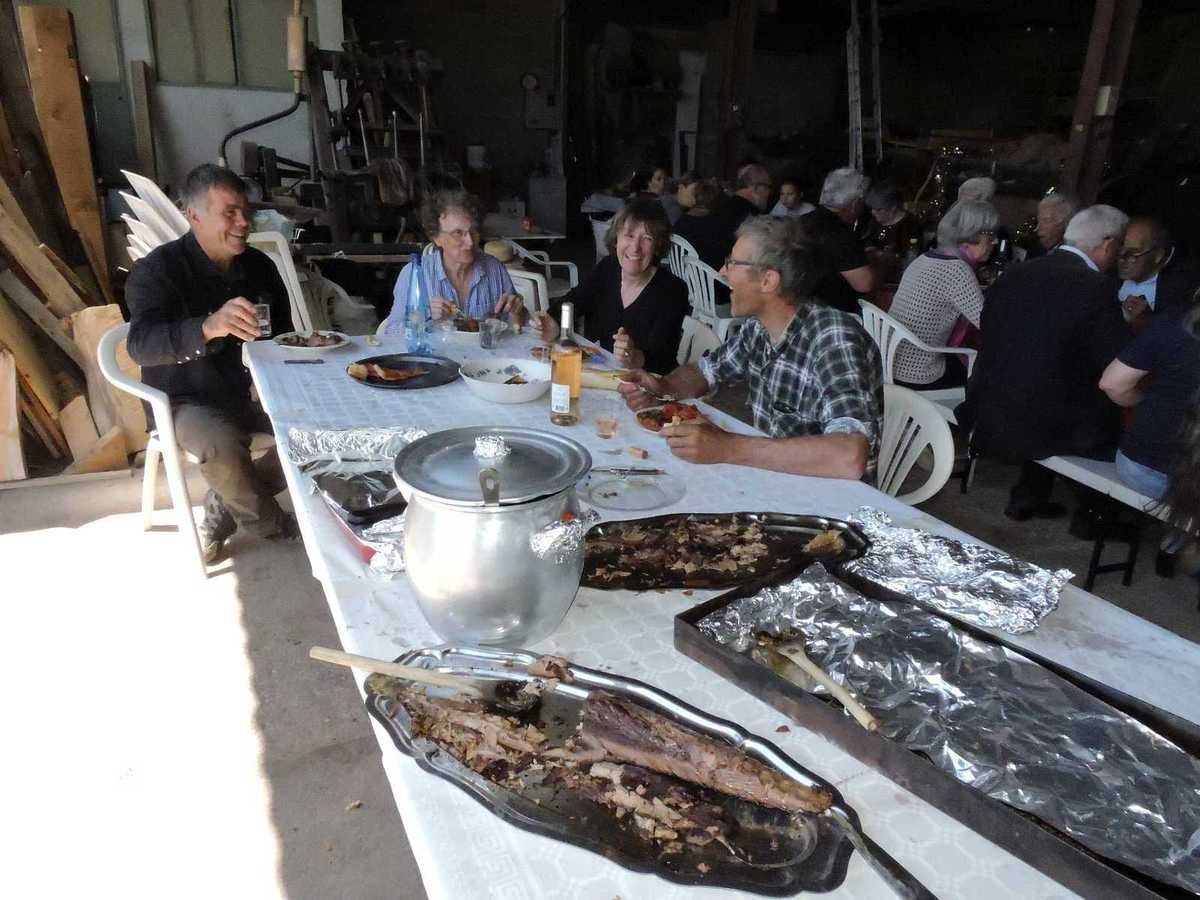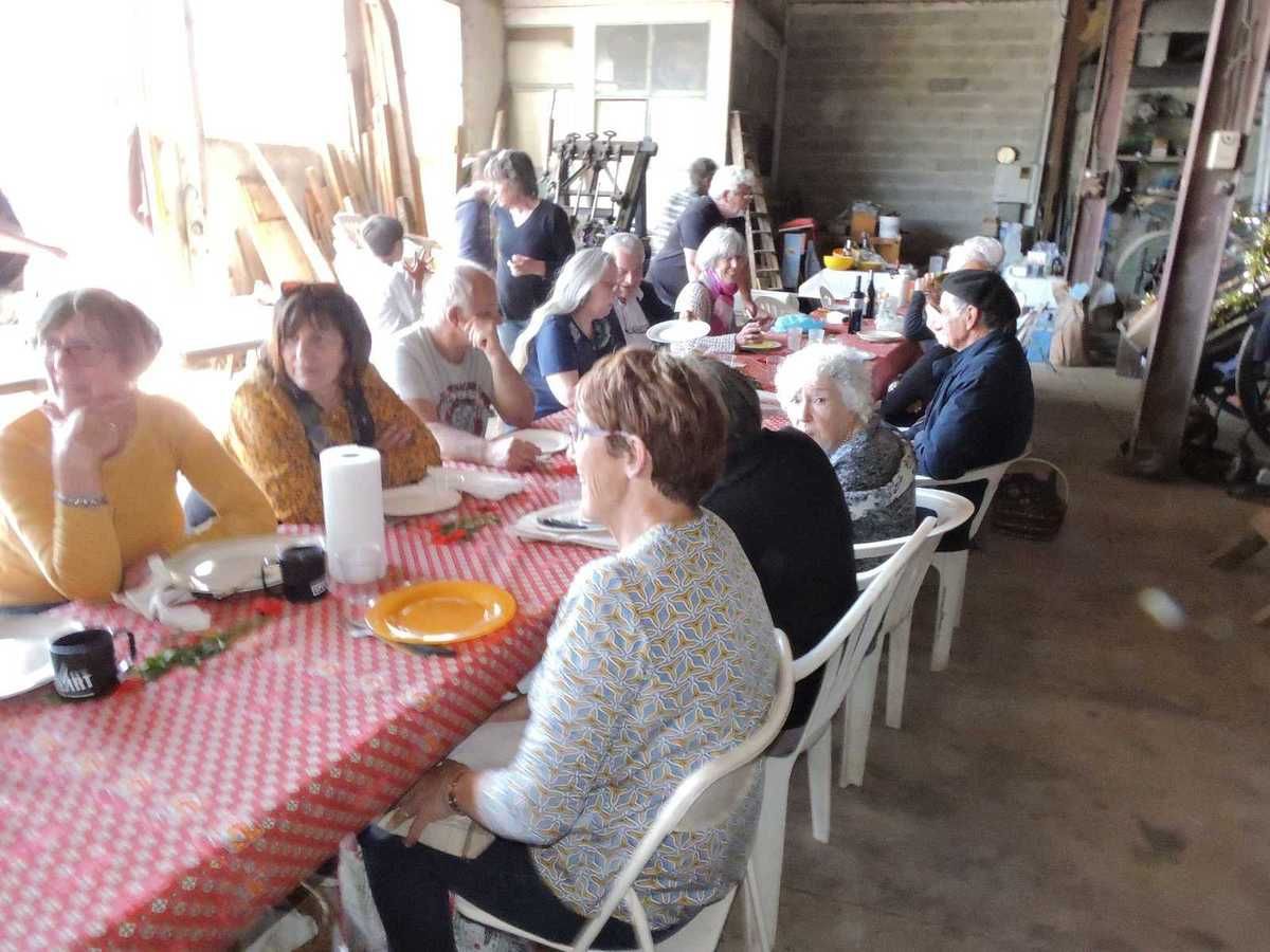 C'est dans la remise où sont rangées toutes les machines anciennes qui servent à cette fête, mais à bien d'autres fêtes aussi, que s'est déroulée cette grande tablée réunissant plus de 30 personnes.