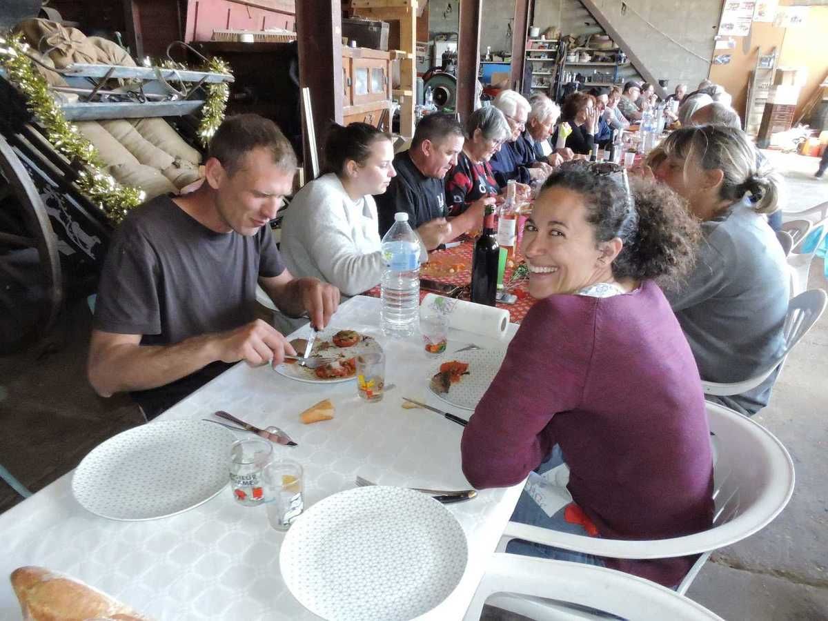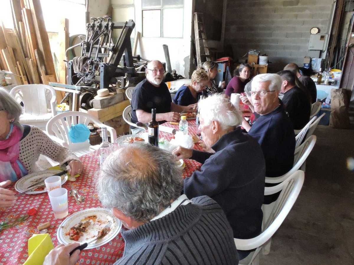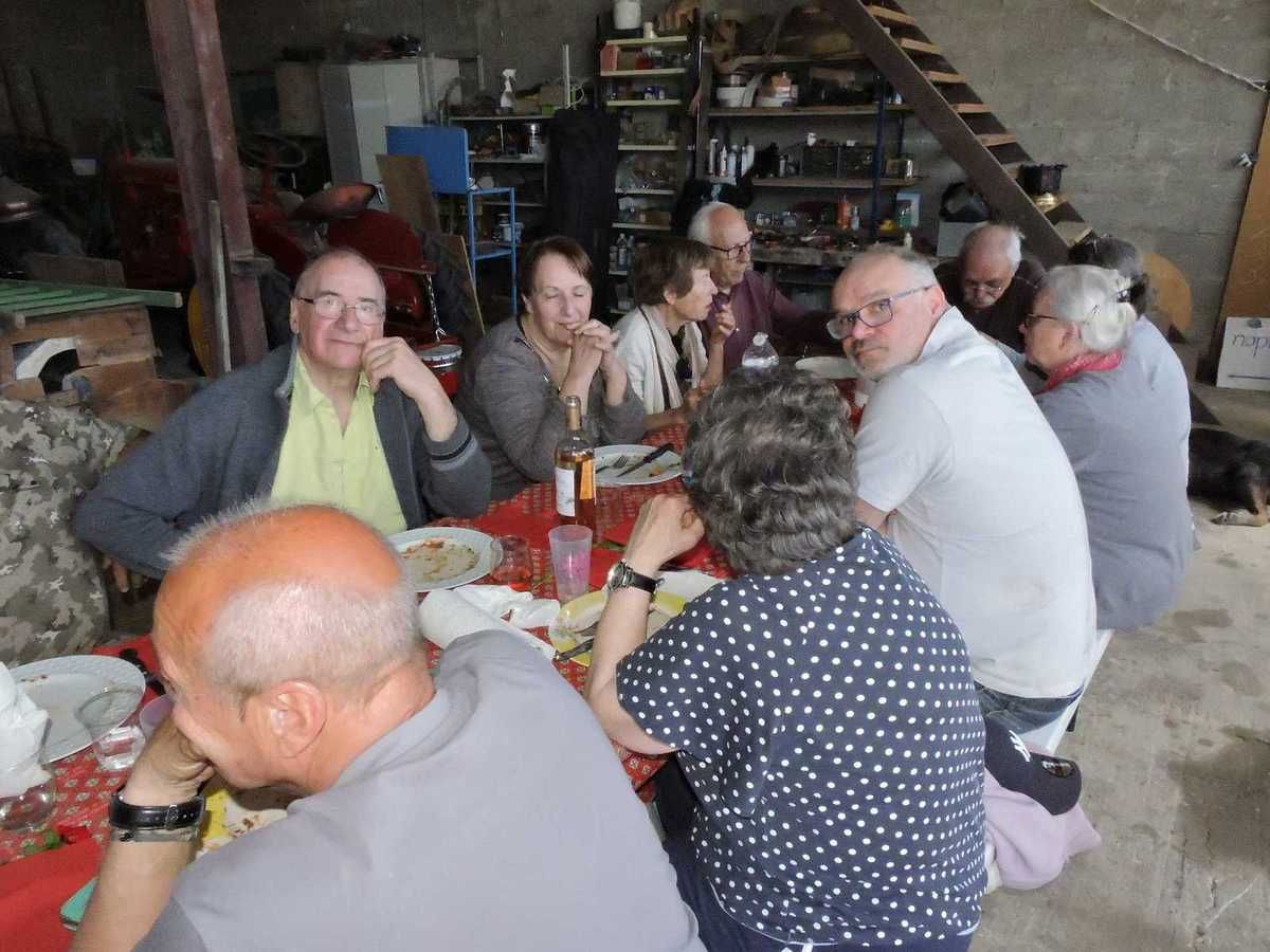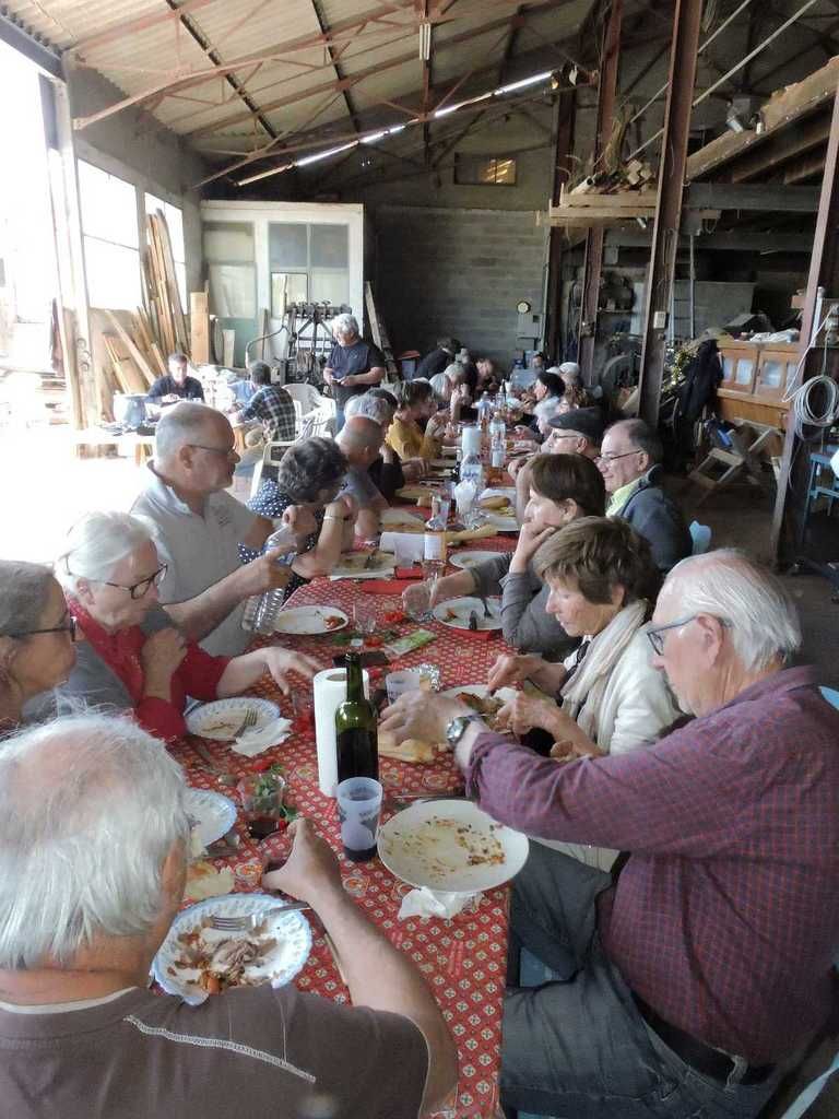 C'est dans la remise où sont rangées toutes les machines anciennes qui servent à cette fête, mais à bien d'autres fêtes aussi, que s'est déroulée cette grande tablée réunissant plus de 30 personnes.