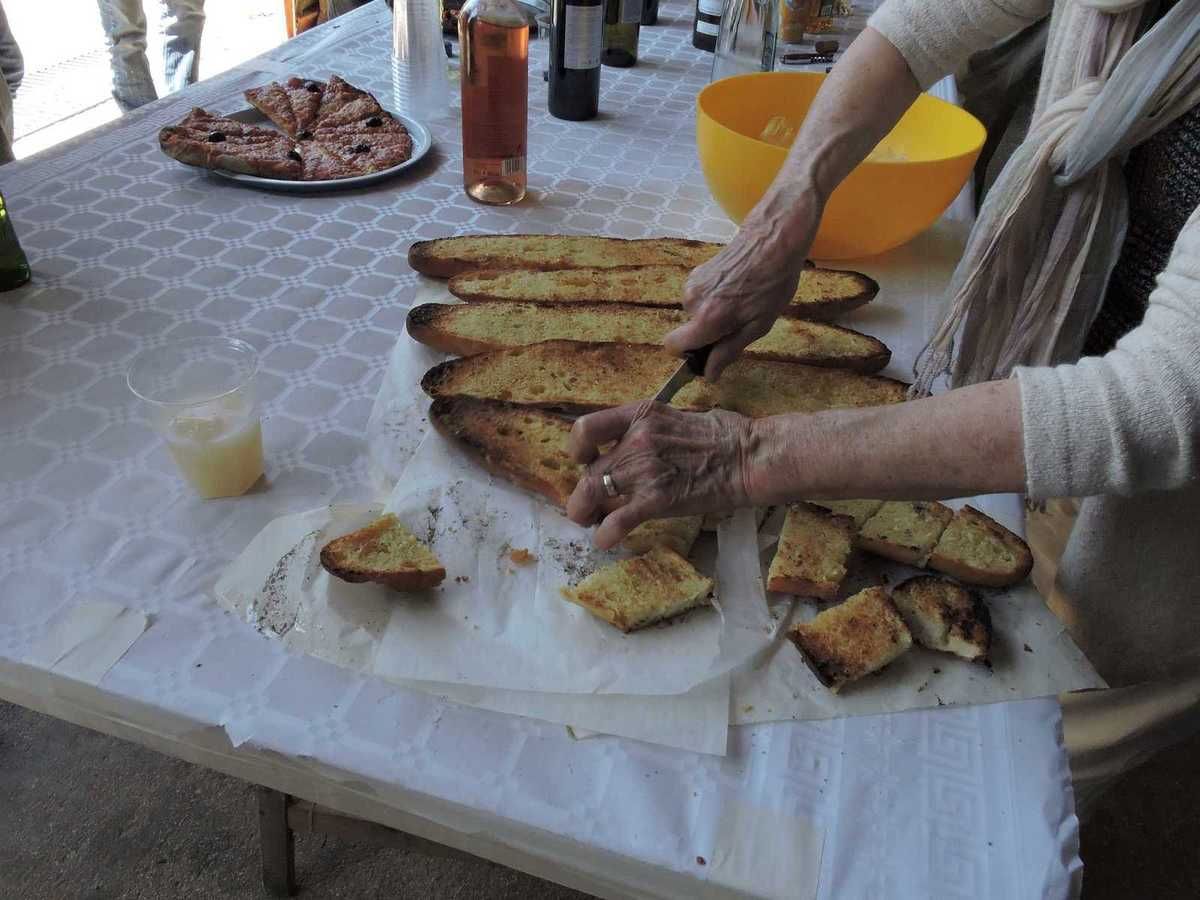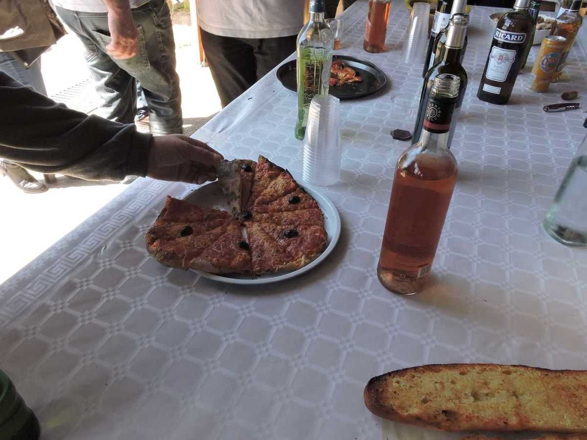 La table de l'apéro est dressée avec moult bouteilles, bien sûr, et que du local, pas la peine de participer à la pollution en faisant venir des vins de loin alors que notre Provence regorge de vins rouges, de vins blancs, de pastis et autres apéros…et de qualité…Quand je pense qu'il y en a qui se gavent de whisky quand notre nature généreuse nous donne tant de bonnes choses. Les pizzas arrivent au fur et à mesure, les pains aillés servent à manger des coulis de tomates odorants de fines herbes provençales et puis, le chasseur de service nous a fait sa traditionnelle terrine de sanglier, du naturel goûteux qui ne va pas résister malgré la taille de la terrine…Et la table finira vide..
